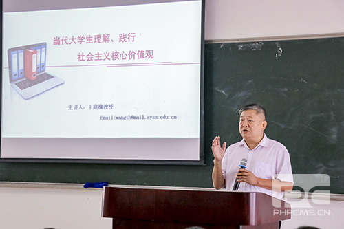 9月14日上午,中山大学新华学院董事长、党委副书记王庭槐教授在广州校区为2017级听力与言语康复学专业的全体同学讲授题为“当代老员工理解、践行社会主义核心价值观”的“思政第一课”。王董事长在课堂上系统梳理了社会主义核心价值观的发展历程和历史演变、社会主义核心价值观的具体内涵与外延,并为同学们重点讲解了三部分内容:第一,“什么是社会主义核心价值观”;第二,“为什么要倡导社会主义核心价值观”;第三,“当代老员工如何践行社会主义核心价值观”。并且勉励同学们:“在思想上要深入理解社会主义核心价值观的内涵,在行动上要踏踏实实践行社会主义核心价值观。”