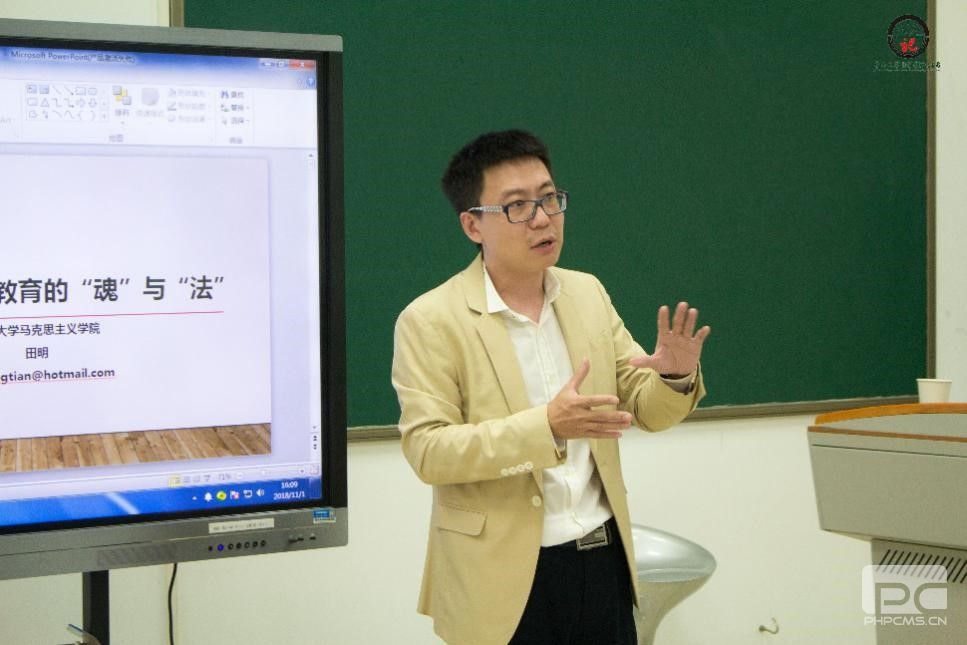 叶启绩教授在讲座开始前讲到,田明博士是暨南大学太阳成集团tyc151cc副教授,硕士生导师,马克思主义基本原理教研室主任,在2018年全国高校青年教师教学竞赛中获得思想政治组一等奖,还曾获得广东省第四届青年教师教学基本功竞赛一等奖、暨南大学本科教学竞赛特等奖,他是暨南大学员工心中的“男神”,我们学校能请到田明老师来“传经送宝”,实属难得,希望参加的老师认真学习。