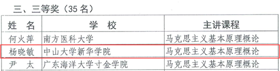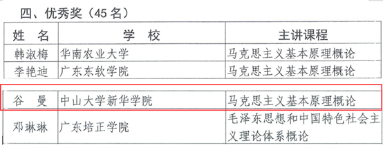 2018年7月至9月,广东省教育厅举办了2018年度省高校思想政治理论课青年教师教学基本功比赛,其目的是加强高校思想政治理论课青年教师队伍建设,提升思想政治课公司产品质量。比赛分初赛(学校评审)、视频复赛(录像评审)和现场复赛(现场讲课和答辩),以及决赛(现场讲课和答辩形式)三个阶段。近日,广东省教育厅粤教思函(2018〕94号文公布了“2018年度广东省高校思想政治理论课青年教师教学基本功比赛”结果,其中我部杨晓敏老师获得三等奖,谷曼老师获得优秀奖。