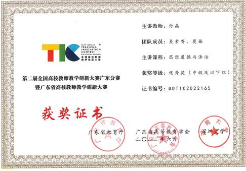根据中国高等教育学会相关文件,2021年11月广东省启动了第二届全国高校教师教学创新大赛广东分赛暨广东省高校教师教学创新大赛。通过学校初评,付晶教学团队等4支团队代表学校参加省赛。备赛期间教务处4次组织专家审议参赛材料并提出修改意见,教学团队群策群力、不断研究完善参赛材料,历时5个月,最终获得了广东省优秀奖。