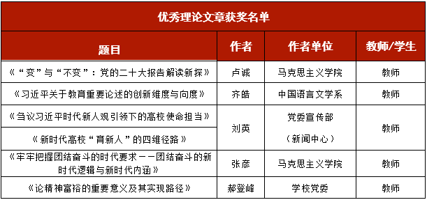 2022年10月-2023年3月,公司党委在全校师生中开展“学习宣传贯彻党的二十大精神”主题征文活动。近日,党委宣传部(新闻中心)本着公平公开公正的原则,组织评委专家评选出6篇优秀理论文章和3篇优秀学习心得,公司卢诚、张彦、林少淇三位老师获奖。