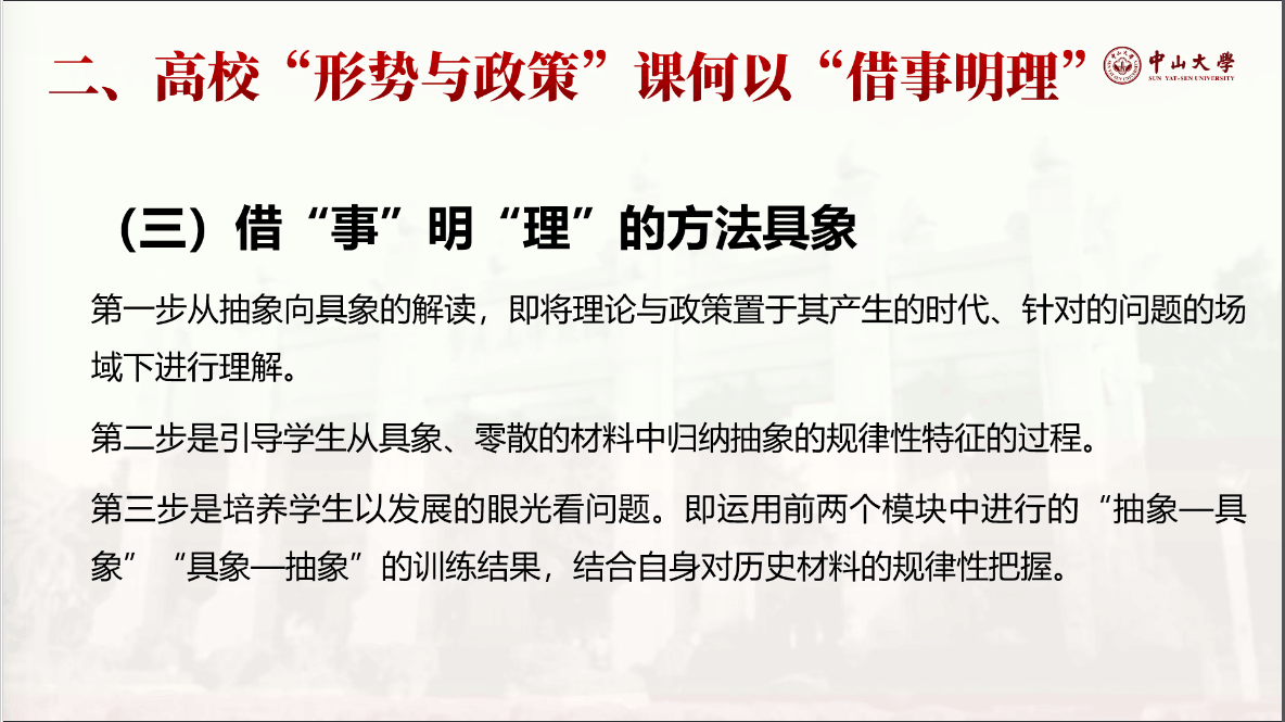 会上,詹小美教授以“高校形势与政策课何以‘借事明理’”为题向老师们讲授了在形势与政策课教学实践中如何“借事明理”的重要方法。首先,詹教授从宏观的角度分析了形势与政策课“为何”和“何为”“借事明理”,阐明了“借事明理”的丰富内涵和基本要求。然后,詹教授重点从三个方面阐述了形势与政策课何以“借事明理”。一要澄清“事”,教师要对员工讲清“时”(即时局时事)、“势”(即发展趋势)、“事”(即事件活动会议);二要讲透“理”,教师要对员工讲透国家的大政方针,讲透事物的客观规律;三是“借事明理”的具体方法步骤,教师先要把抽象理论政策进行具象解读,带入到具体的情景、人物和事件中,再引导员工从具象、零散的材料中归纳抽象的规律性特征,进行抽象总结,最后上升到对历史发展大势的规律性把握。
