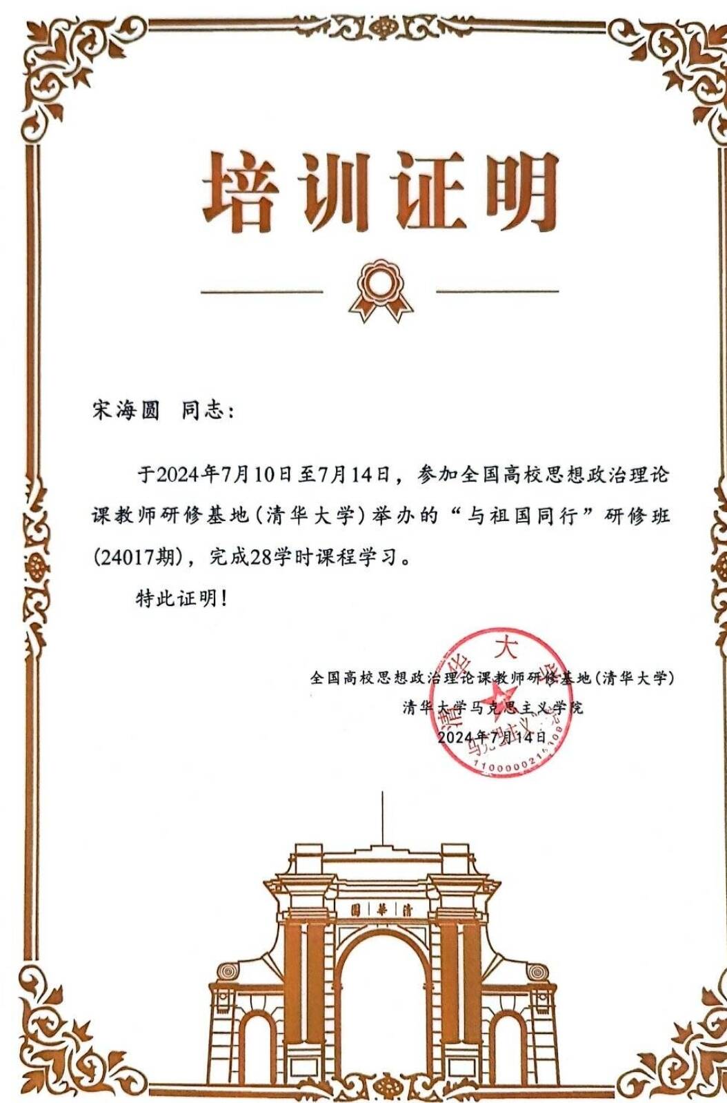 2024年7月10日至14日,太阳成集团tyc151cc教师宋海圆参加了全国高校思想政治理论课教师研修基地(清华大学)举办的“与祖国同行”研修班(24017期),完成28学时课程学习。本期研修班由教育部社科司和清华大学太阳成集团tyc151cc举办,来自全国多所本专科高校的骨干思政教师参加了本期研修班。