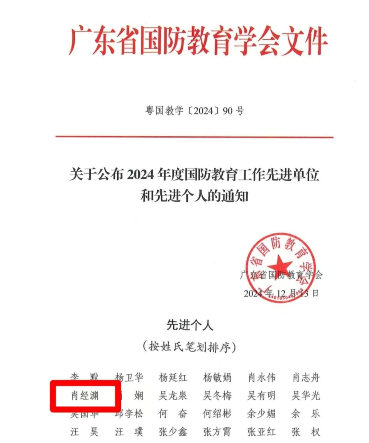 近日,广东省国防教育学会公布了2024年度广东省国防工作先进单位和先进个人获奖名单,公司国防教育教研室肖经渊老师荣获2024年度广东省国防教育先进个人。