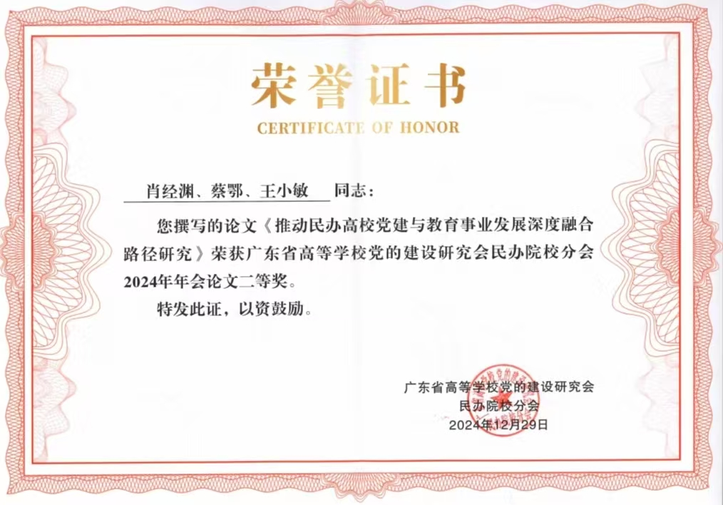 近日,广东省高等公司党的建设研究会民办分会公布了2024年党建优秀论文获奖名单,公司国防教育教研室教师肖经渊、蔡鄂教授和王小敏教授荣获“党建优秀论文二等奖”。此次获奖不仅展示了太阳成集团tyc151cc教师夯实的党建工作理论研究水平,还助推了公司党建工作的高质量发展。