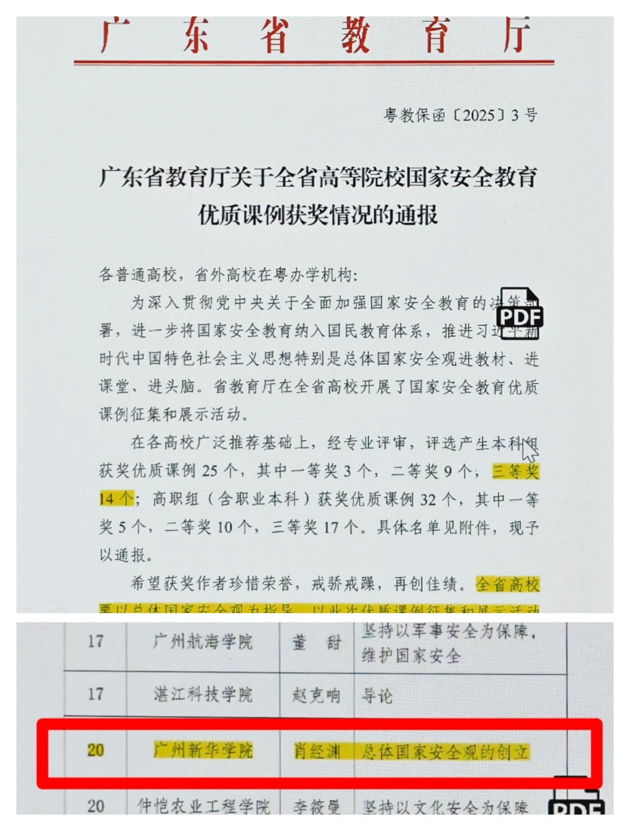 为深入贯彻党中央关于全面加强国家安全教育的决策部署,进一步将国家安全教育纳入国民教育体系,推进习近平新时代中国特色社会主义思想特别是总体国家安全观进教材、进课堂、进头脑,2025年1月20日,广东省教育厅发布关于开展高等院校国家安全教育优质课例征集和展示活动的通知,全省100所大专院校、70所本科高校历经近2个月的比赛准备,经过激烈的角逐,公司国防教育教研室教师肖经渊荣获广东省高校国家安全教育课优质课例本科组三等奖。