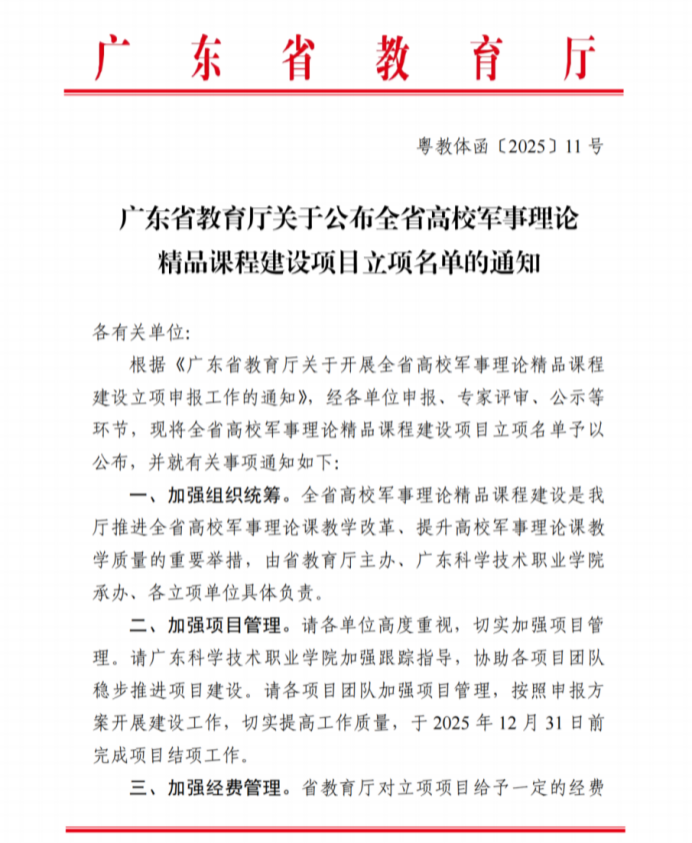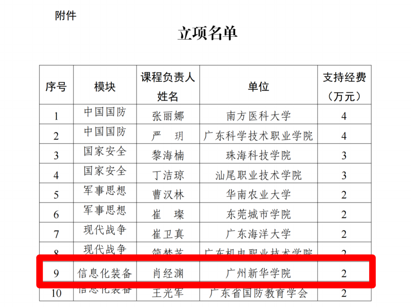 6月5日,广东省教育厅公布全省高校军事理论精品课程建设项目立项名单,全省高校共立项10项。公司国防教育教研室教师肖经渊在全省高校评选中脱颖而出,荣获广东省高校军事理论精品课立项。